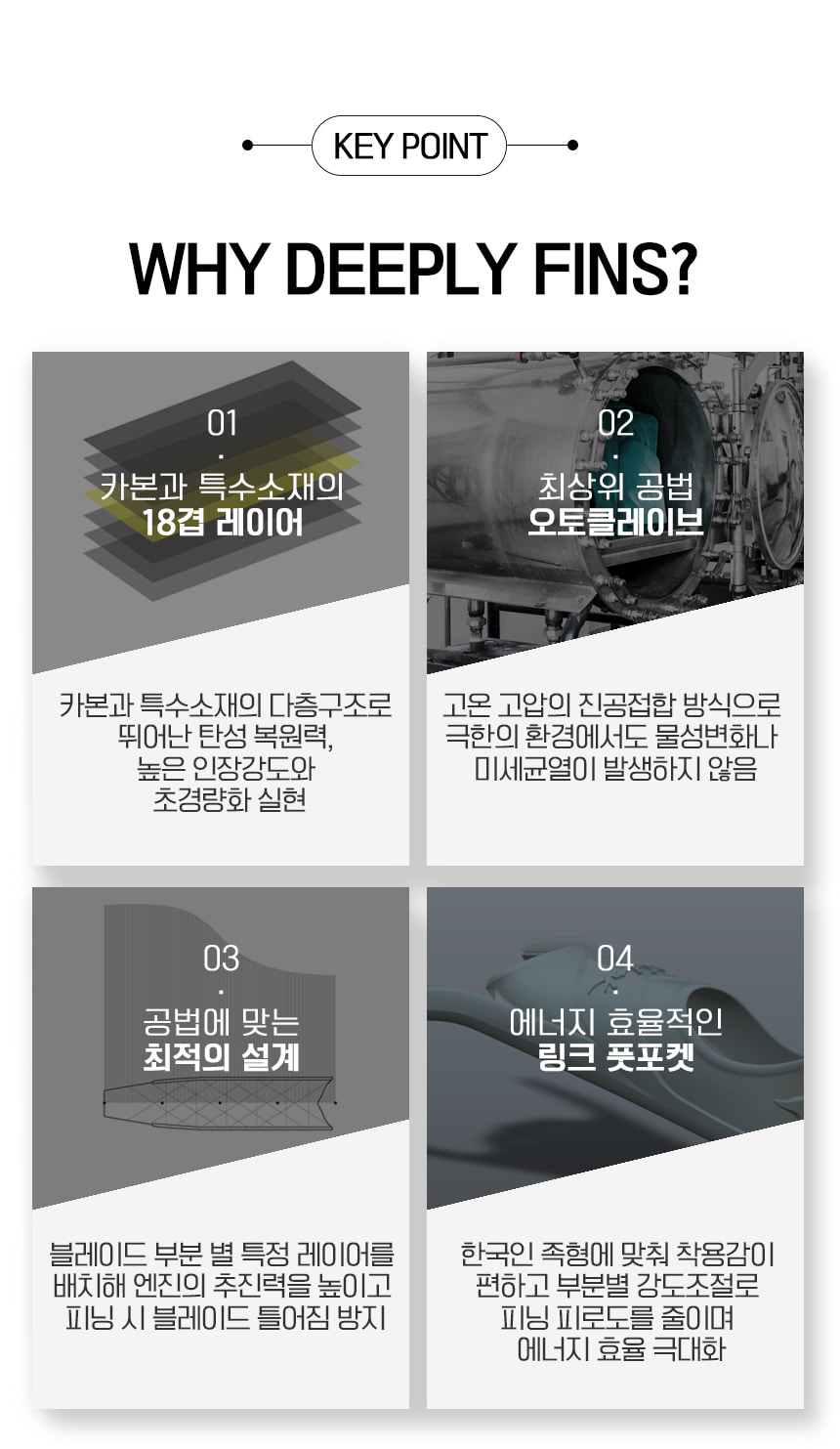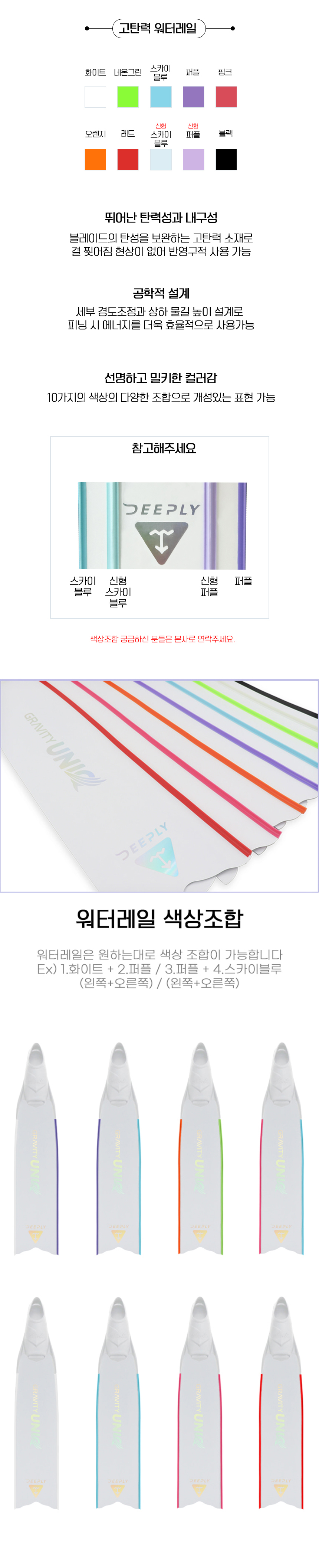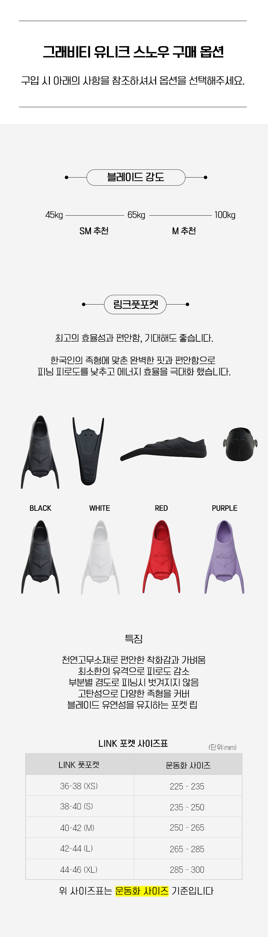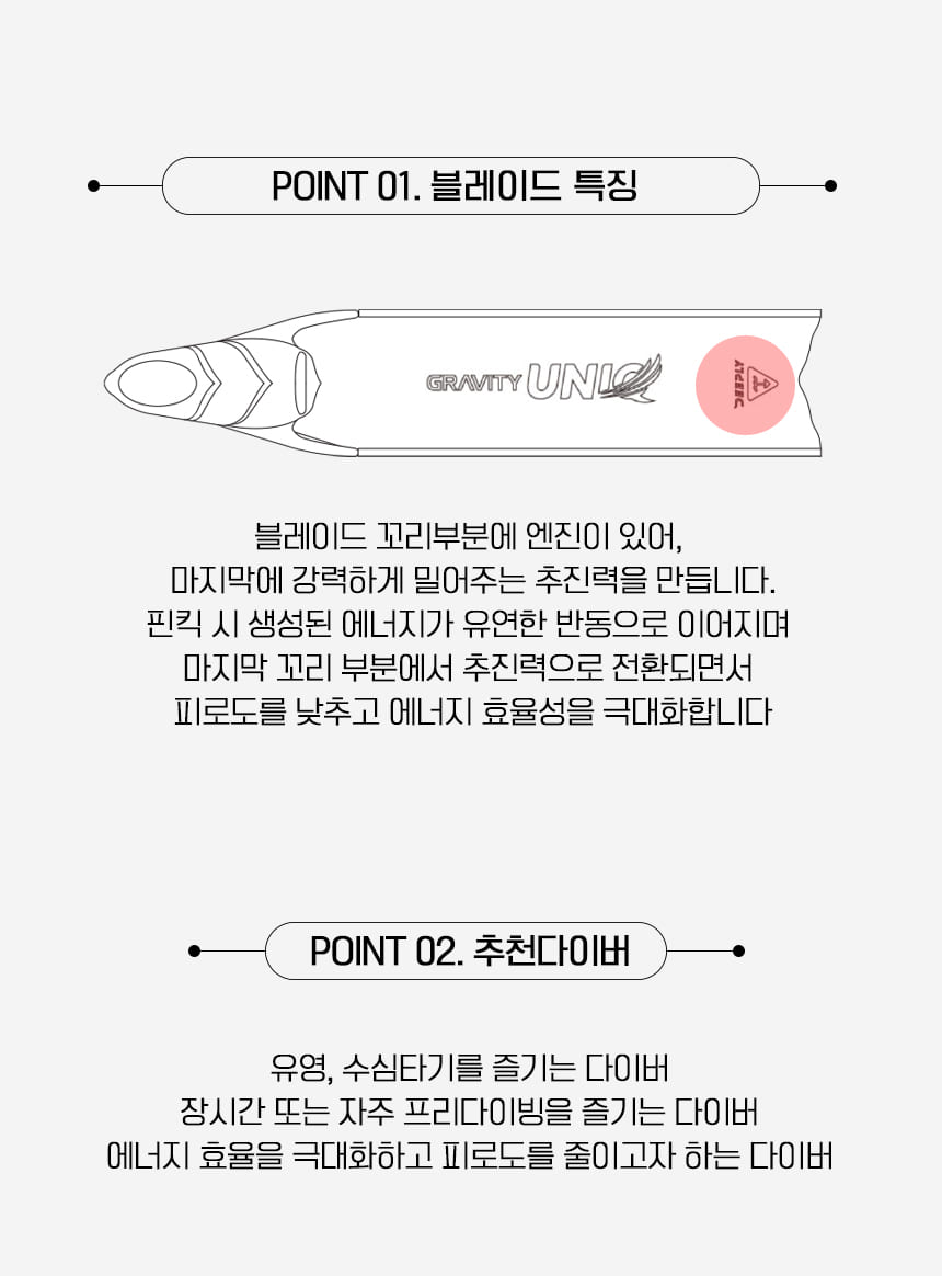 그래비티 유니크는 그래비티 시리즈의 최상위 핀으로 핀킥의 에너지 효율성을 극대화합니다. 발목에서 나가는 힘의 전달이 부드럽고 완만하지만 핀 끝에서 탄성있게 추진력을 냅니다.