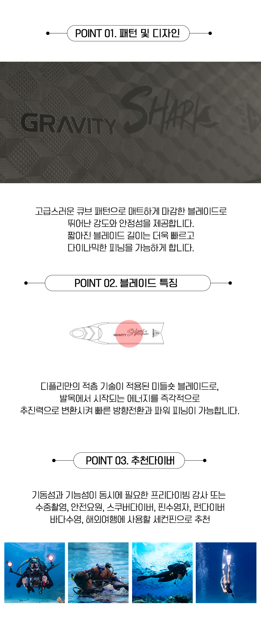 그래비티 샤크는 상어가 사냥을 하듯 순간적인 스피드를 구사할 수 있으며 유연한 퍼포먼스로 프로들의 만족도를 높입니다.
