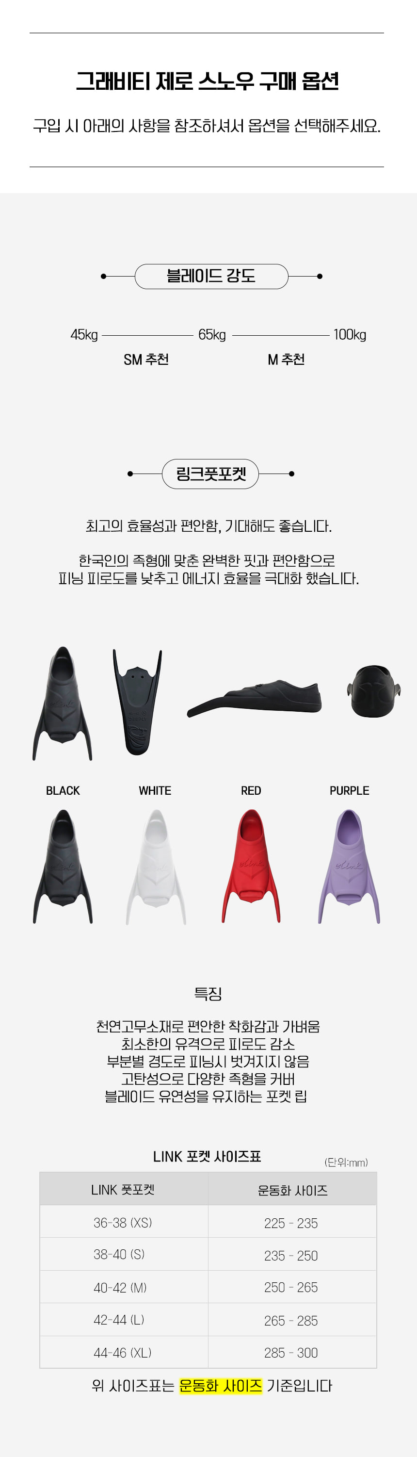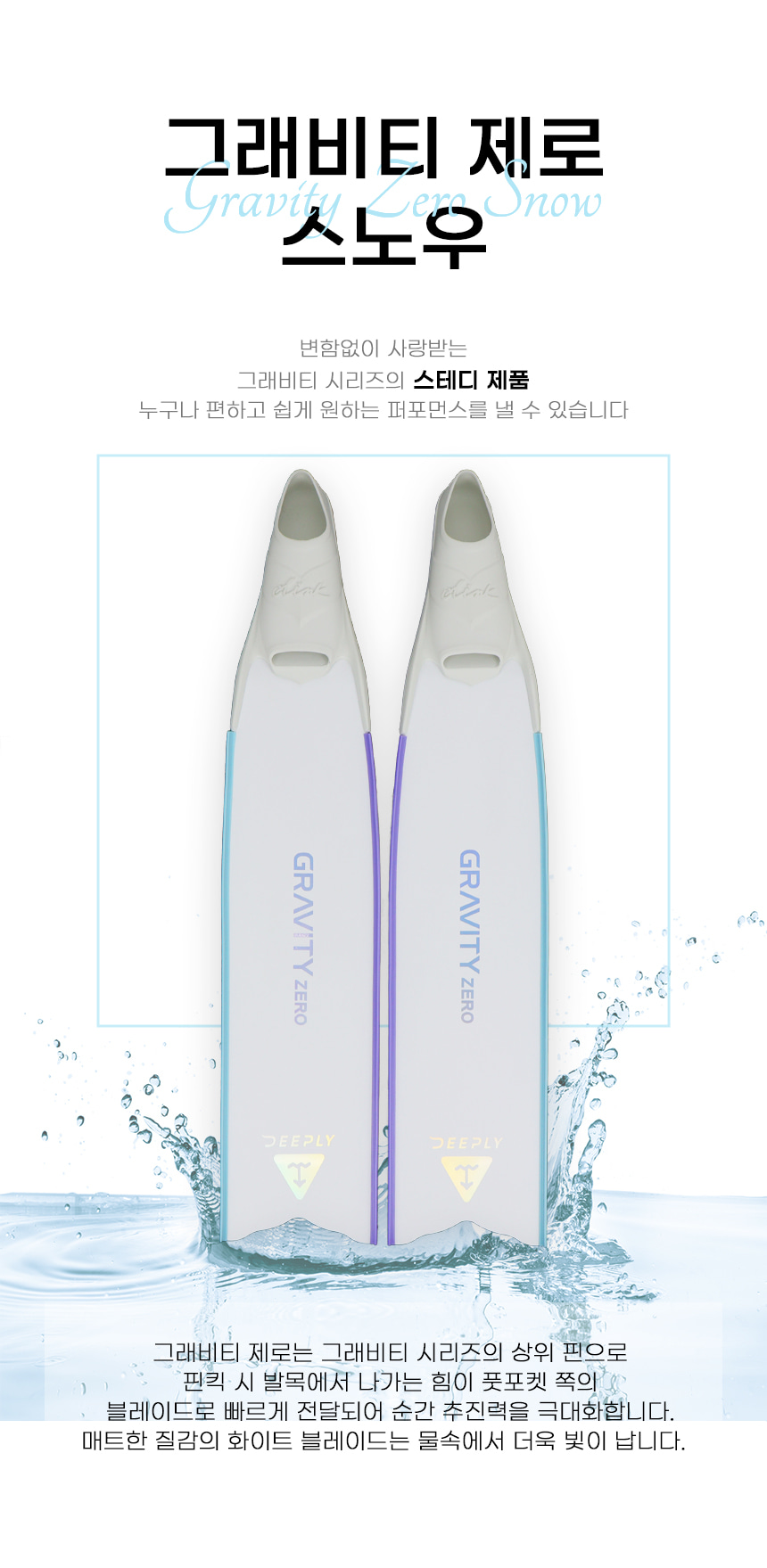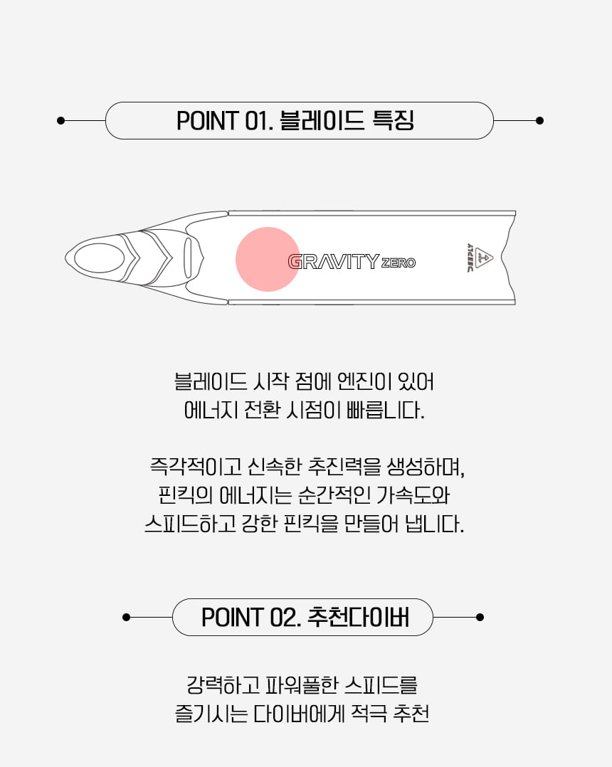 그래비티 제로는 그래비티 시리즈의 상위 핀으로 핀킥 시 발목에서 나가는 힘이 풋포켓 쪽의 블레이드로 빠르게 전달되어 순간 추진력을 극대화합니다.